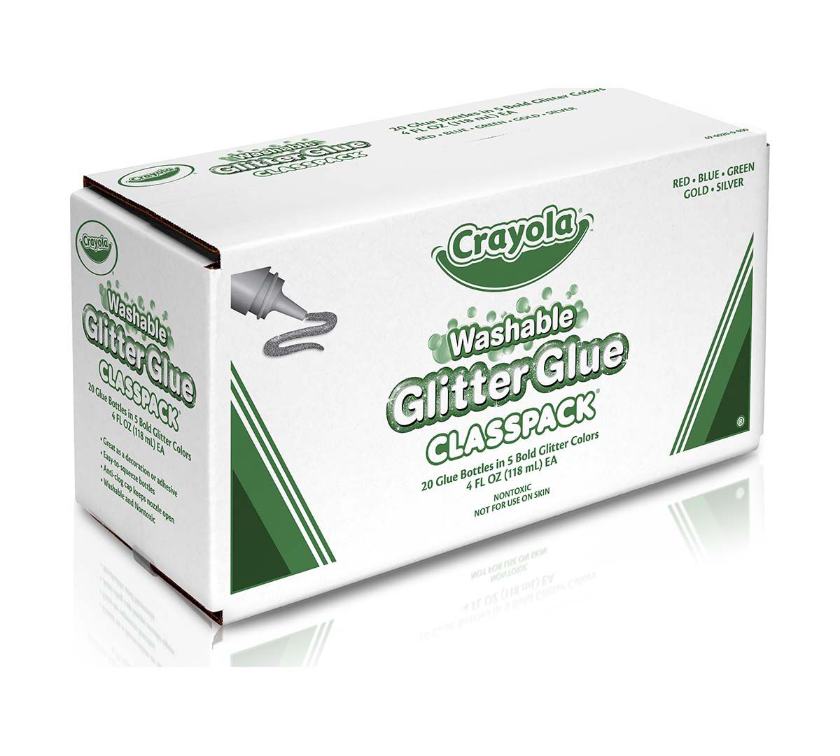 Bottles of washable glitter glue in 5 bold colors including red blue green gold and silver. Crayola Glitter Glue dries quickly in approximately 30 minutes. Whether used as glue or a decorative accent Crayola Glitter Glue provides a fun shimmer to anything kids create.
